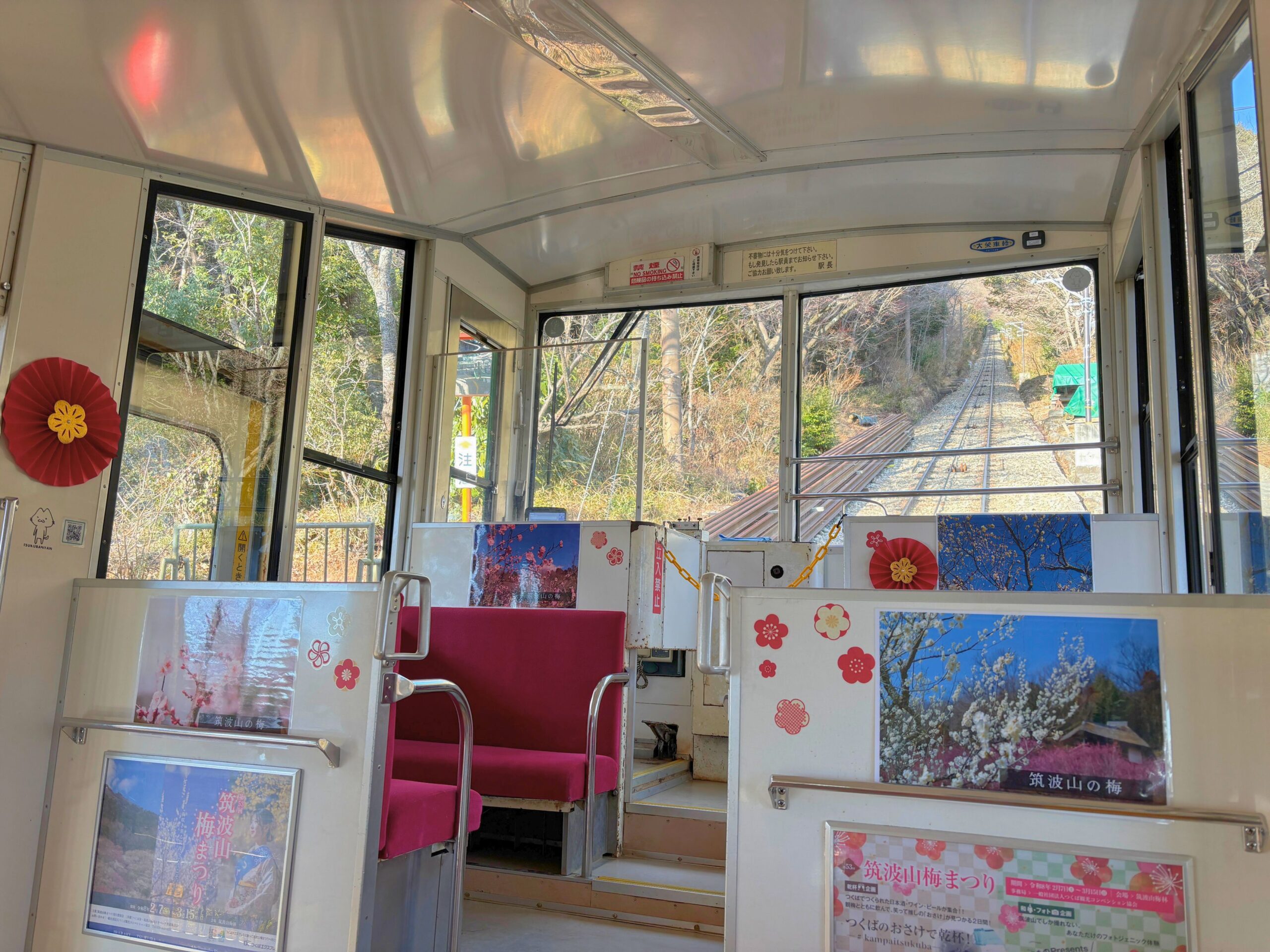 梅装飾ケーブルカーケーブルカーの内装が「梅の花」仕様となります。 ※両車両(緑色、赤色)とも梅の花仕様となります。 【開催場所】 筑波山ケーブルカー 【ケーブルカー営業時間】 ◆2月 平日 9:20~16:40 土日祝日 9:20~16:40 ◆3月 平日 9:20~16:40 土日祝日 9:20~17:00 毎時00分,20分,40分の20分間隔で運行しております。