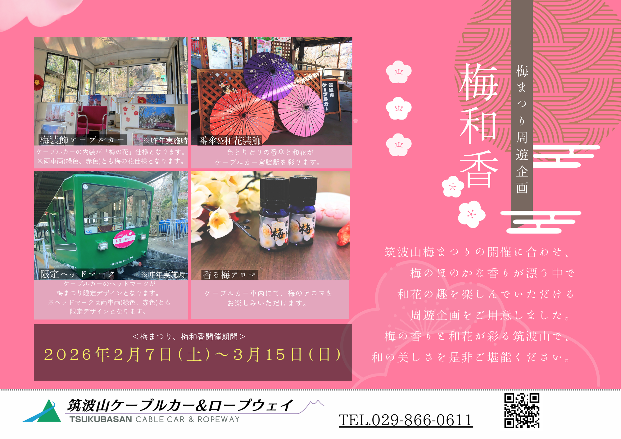 限定ヘッドマークケーブルカーのヘッドマークが梅まつり限定デザインとなります。 ※ヘッドマークは両車両(緑色、赤色)とも限定デザインとなります。 【開催場所】 筑波山ケーブルカー 【ケーブルカー営業時間】 ◆2月 平日 9:20~16:40 土日祝日 9:20~16:40 ◆3月 平日 9:20~16:40 土日祝日 9:20~17:00 毎時00分,20分,40分の20分間隔で運行しております。