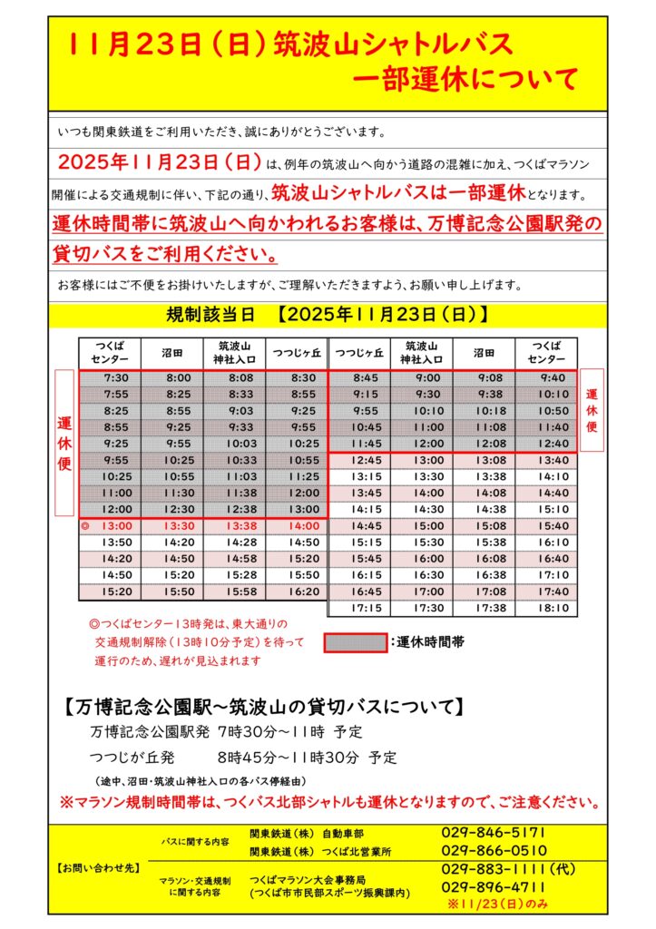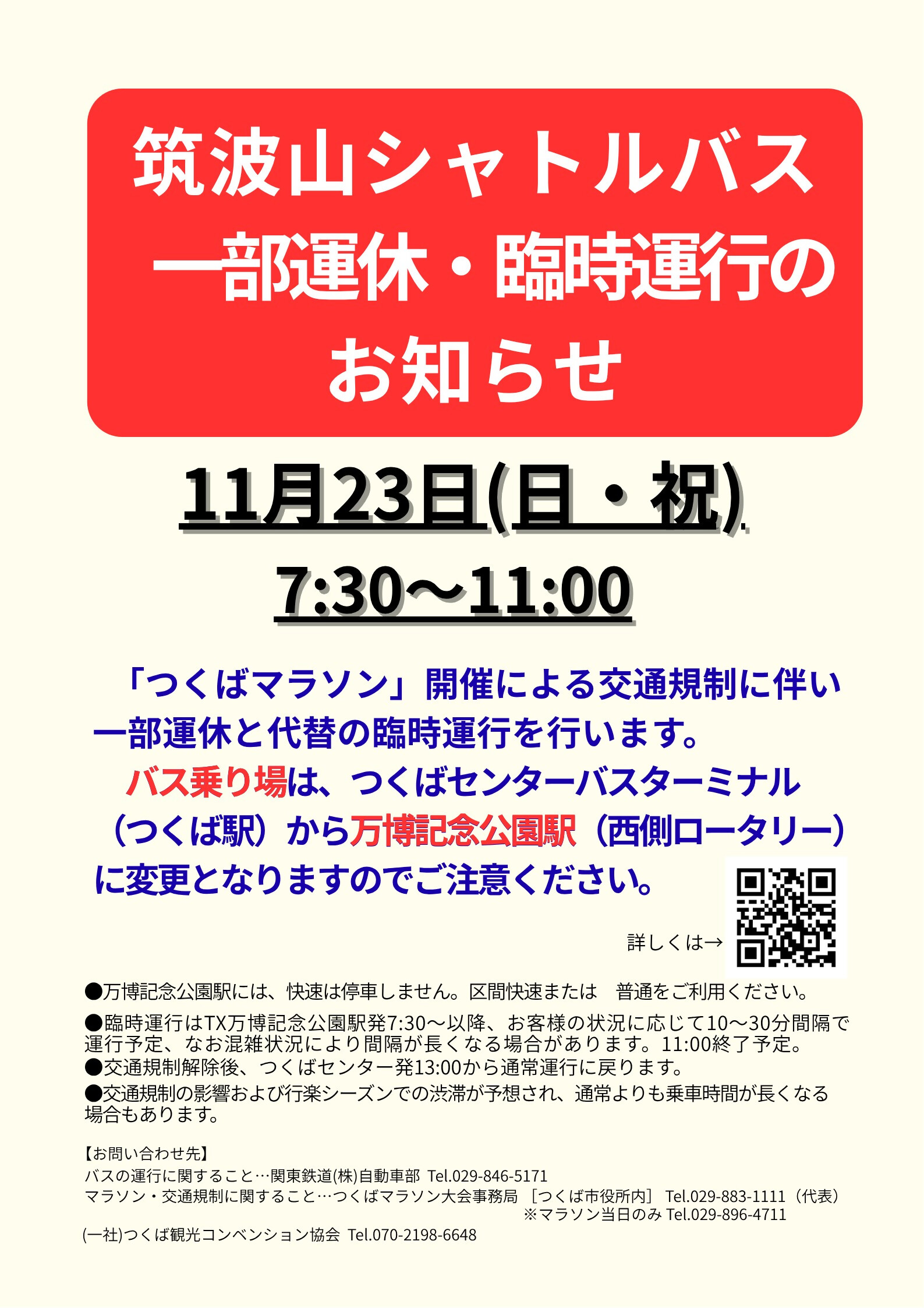 つくばマラソン【11/23(日)】の交通規制に伴う筑波山シャトルバスの運行について(一部運休及び道路迂回による臨時運行)
